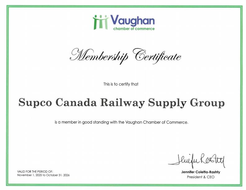 Supco Canada Railway Supply Group is a proud member of the Vaughan Chamber of Commerce (VCC) — the premier business association serving Vaughan, Ontario's business community since 1977. Our membership reflects our commitment to the local business ecosystem and our roots as a Maple, Ontario manufacturer.